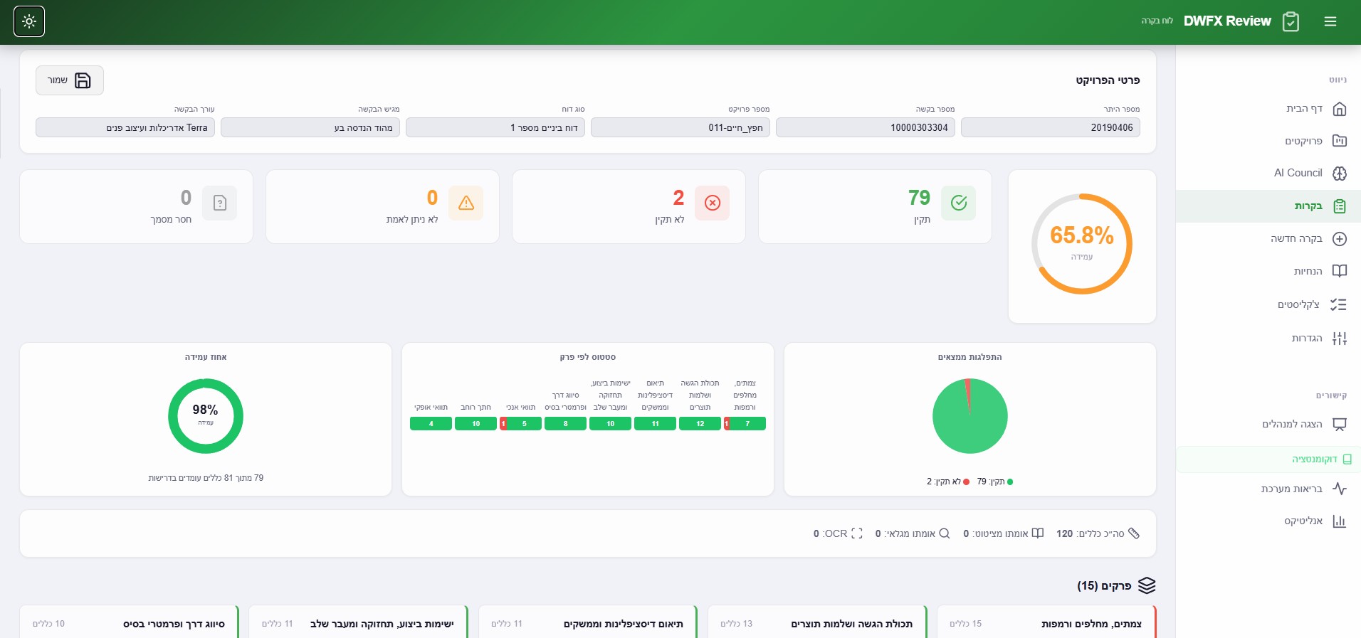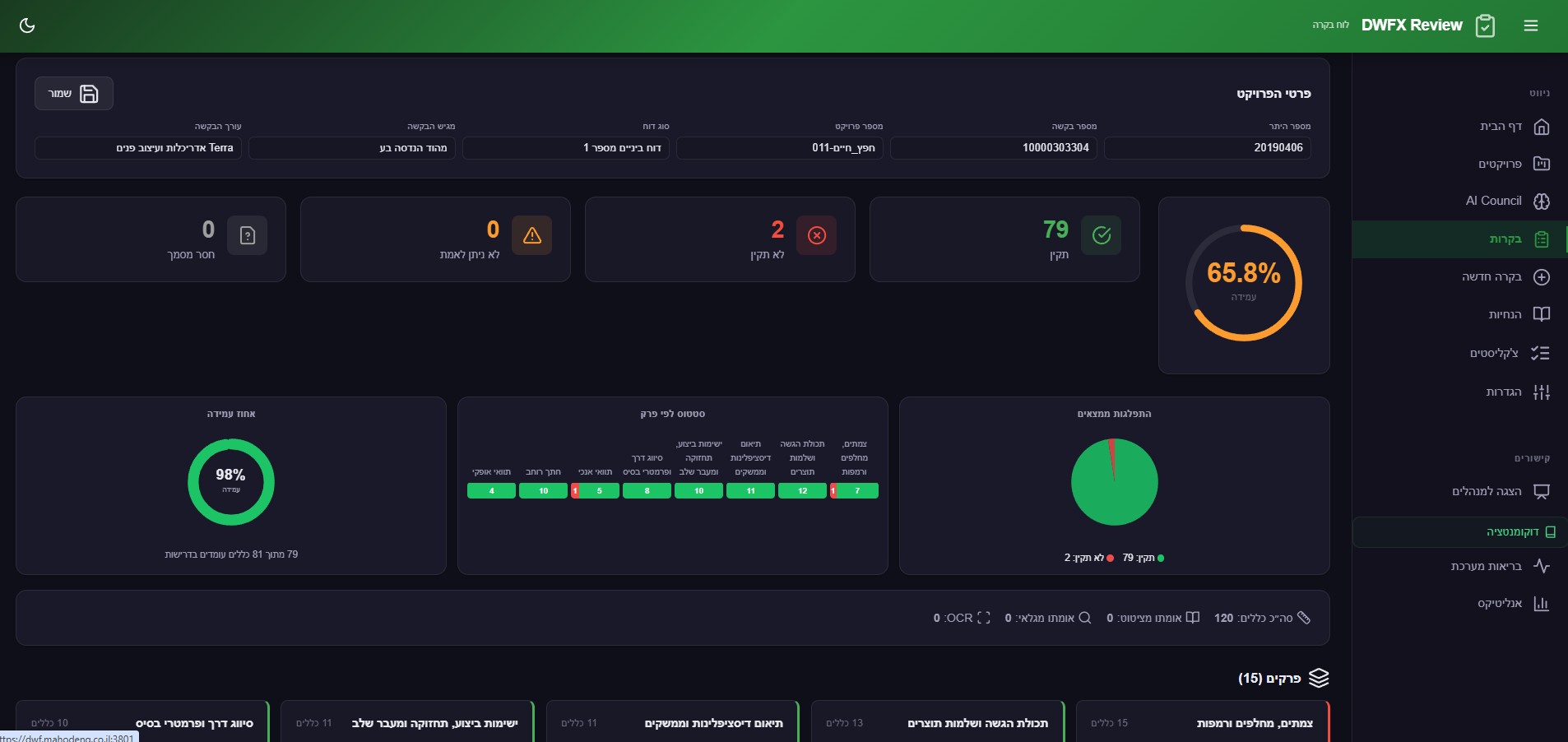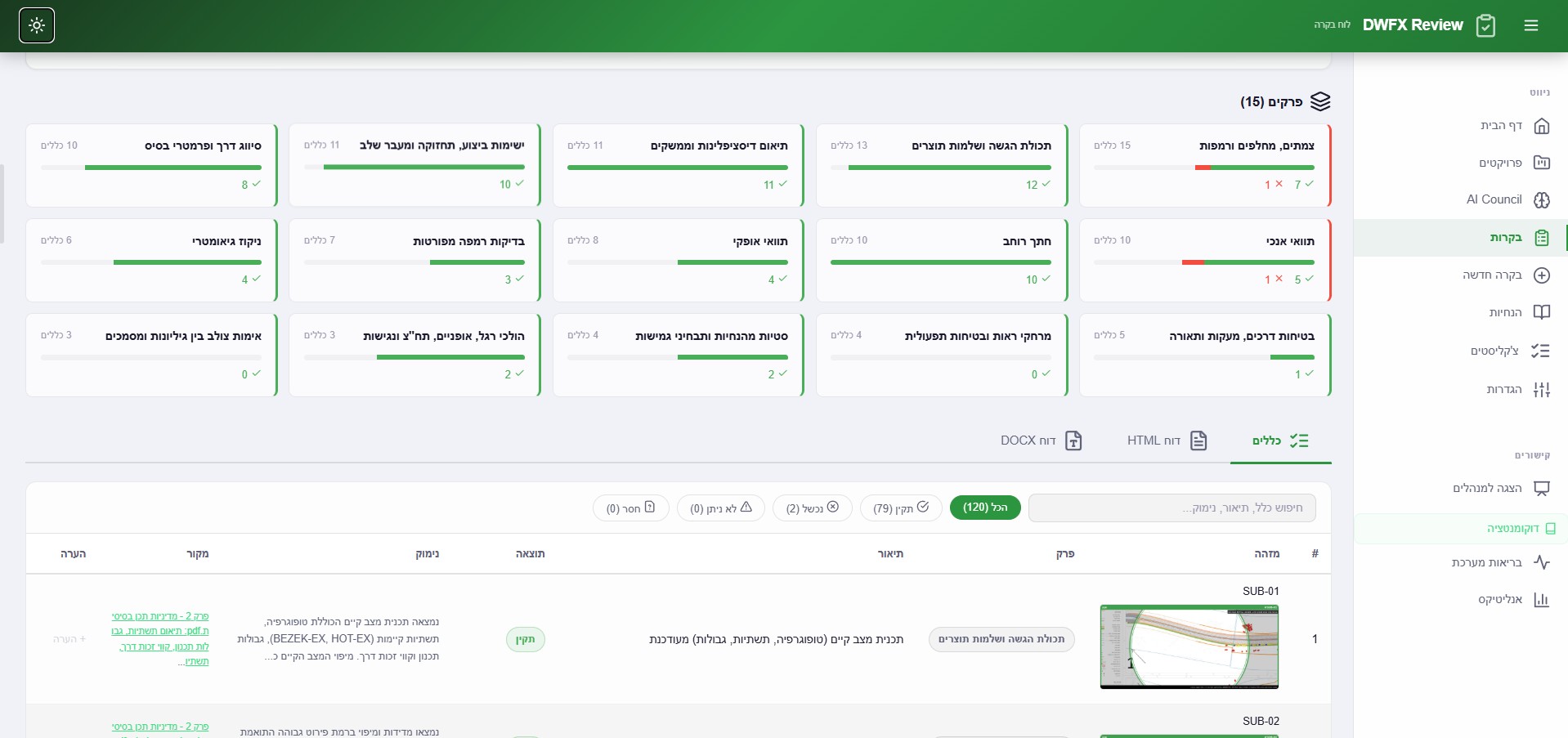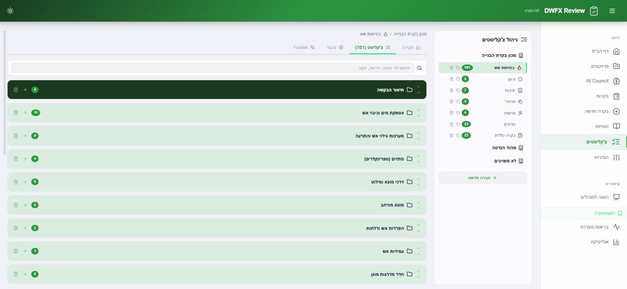 מאות כללי בדיקה ב-11 דיסציפלינות. מותאמים לחברה (מכון בקרה / משרד הנדסה) ולסוג הפרויקט. כל סעיף מקושר למסמך הנחיות.