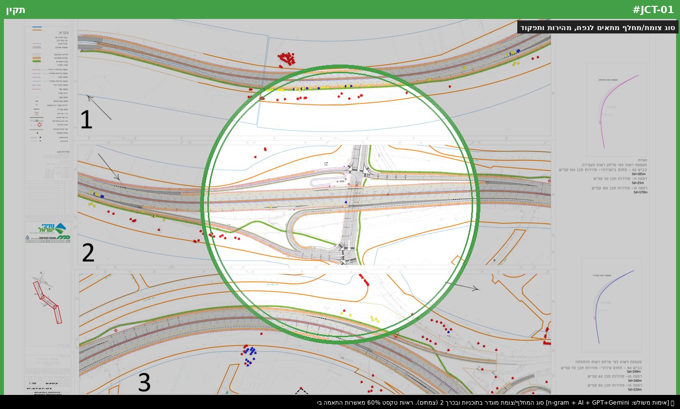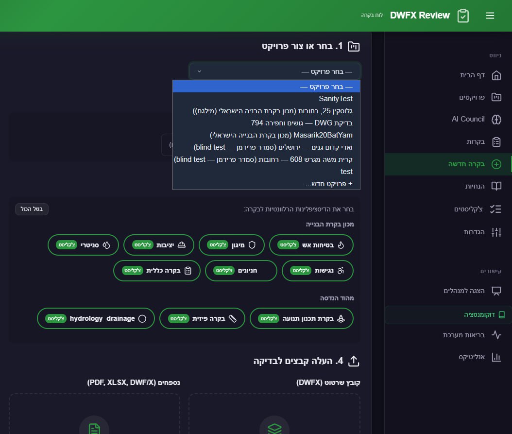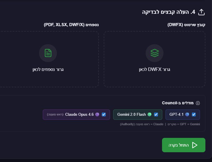 מערכת AI לבקרת תכן אוטומטית. שלושה מודלי AI סורקים שרטוטים הנדסיים בכל דיסציפלינה מול התקנות, התקנים וההנחיות המקצועיות הרלוונטיות