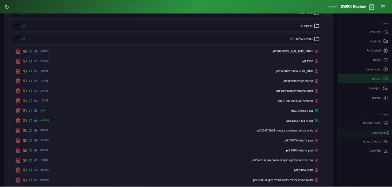 כל ממצא מגובה בציטוט ישיר מתוך מסמך ההנחיות: עמוד, סעיף, מקטע. ספריית הנחיות עם מאות מסמכים בעשרות תיקיות מקצועיות. כל ציטוט מקושר לעמוד המדויק.