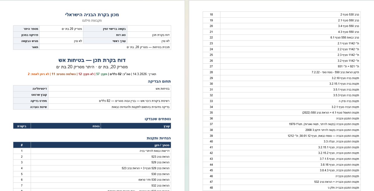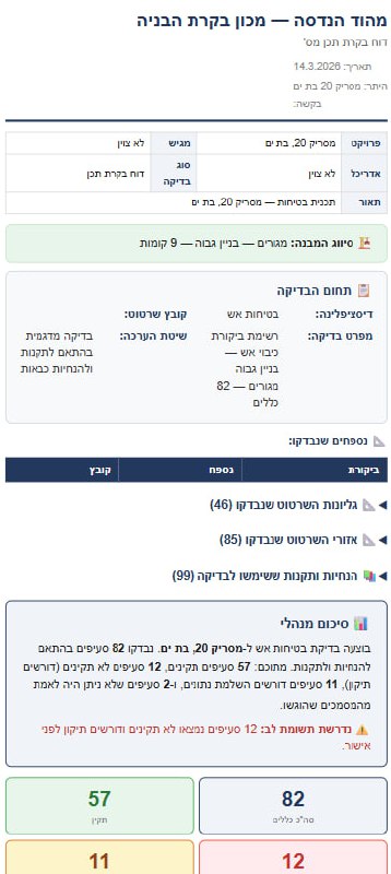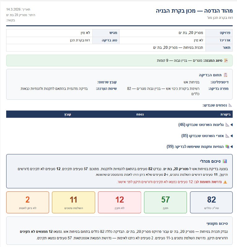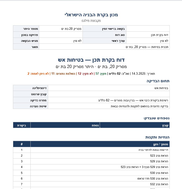 מותאמת למכוני בקרה, משרדי הנדסה ורשויות מקומיות. נבדקה ואומתה מול בודקים מומחים. טיוטת דוח בקרה תוך כשעה.