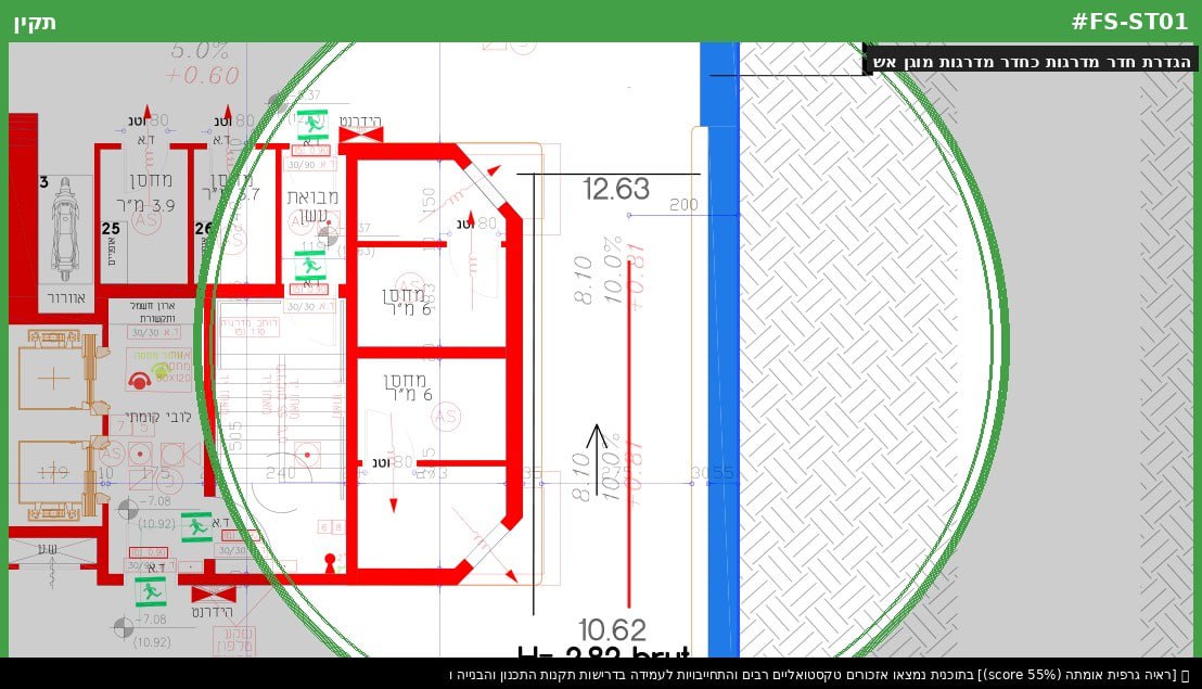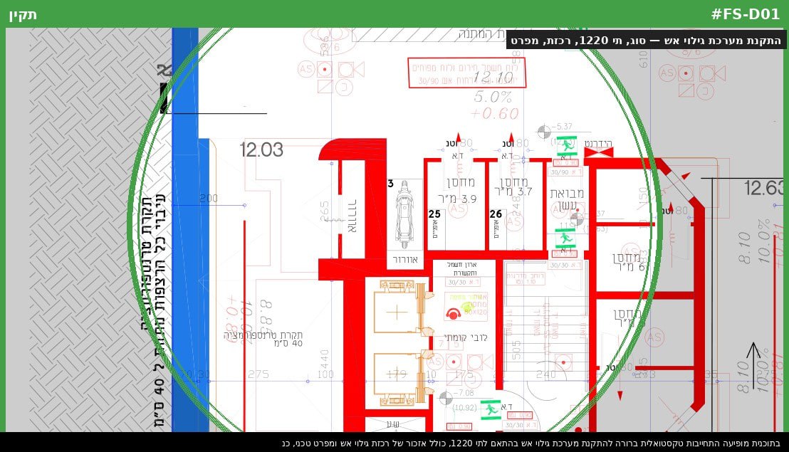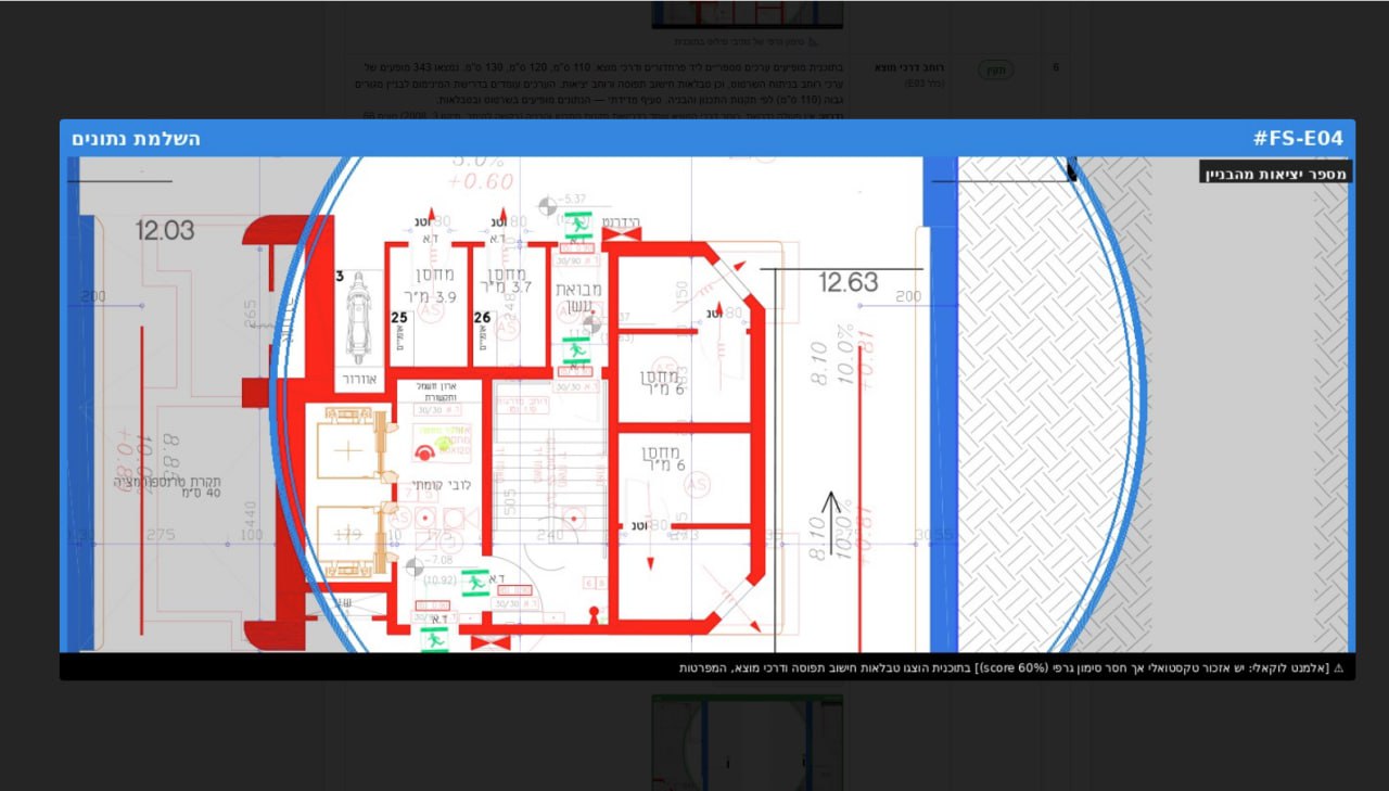 זיהוי אוטומטי של אזורים רלוונטיים בשרטוט. לכל סעיף בדיקה, מסגרת כחולה על האלמנט שנבדק. הבודק רואה בדיוק מה המערכת בחנה.