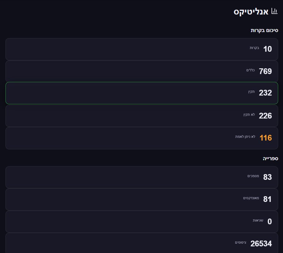 | תקנות ישראליות | ✓ | ✗ | ✗ | ✗ | ✗ | ✗ |