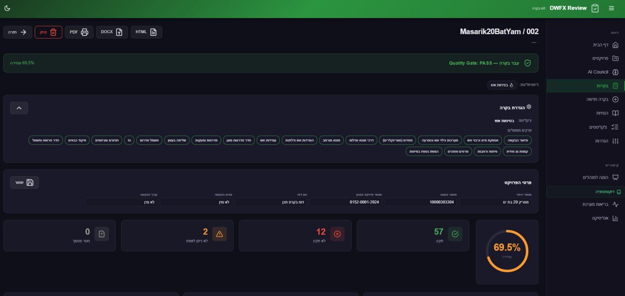 | DWFX AI Review מהוד הנדסה | CivCheck Clariti (US) | CodeComply CivicPlus (US) | PlanCheckPro US/FL | InspectMind US | Firmus AI נרכשה $79.5M ישראל | |